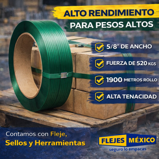 El fleje plástico de poliéster (PET) verde moleteado de 5/8″ es la solución ideal para embalajes industriales de alto rendimiento, sustituyendo al fleje de acero en múltiples aplicaciones gracias a su alta resistencia, elasticidad controlada y seguridad en el manejo.